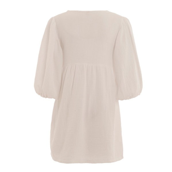 Laat je garderobe stralen met de Drew jurk in de kleur Ecru. Deze luchtige zomerjurk is gemaakt van zacht mousseline dat comfortabel aanvoelt op de huid en heerlijk ademend is tijdens warme dagen. De elegante V-hals en speelse driekwart pofmouwen geven een vrouwelijke touch, terwijl het losvallende silhouet soepel met je meebeweegt.