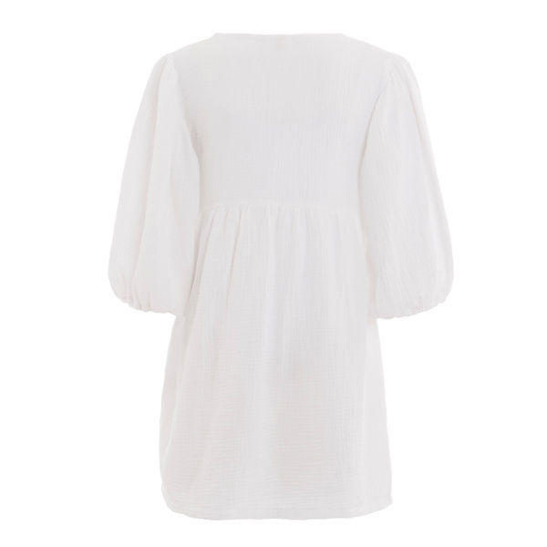 Laat je garderobe stralen met de Drew jurk in de kleur Woolwhite. Deze luchtige zomerjurk is gemaakt van zacht mousseline dat comfortabel aanvoelt op de huid en heerlijk ademend is tijdens warme dagen. De elegante V-hals en speelse driekwart pofmouwen geven een vrouwelijke touch, terwijl het losvallende silhouet soepel met je meebeweegt.